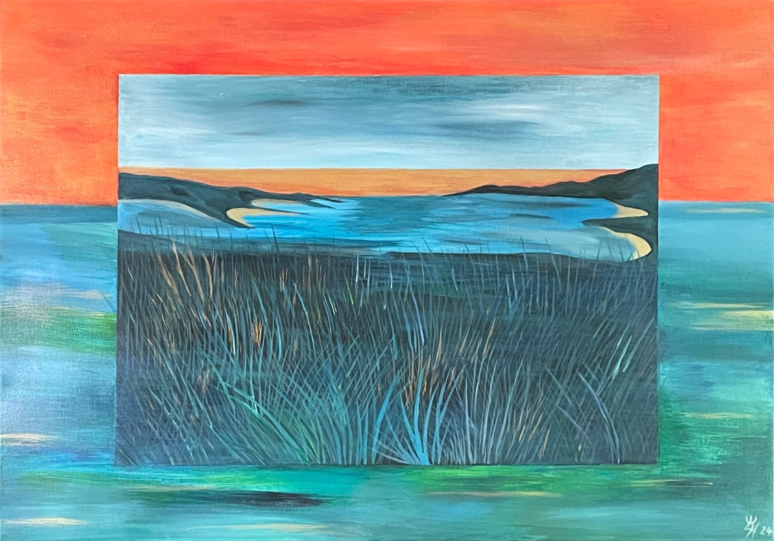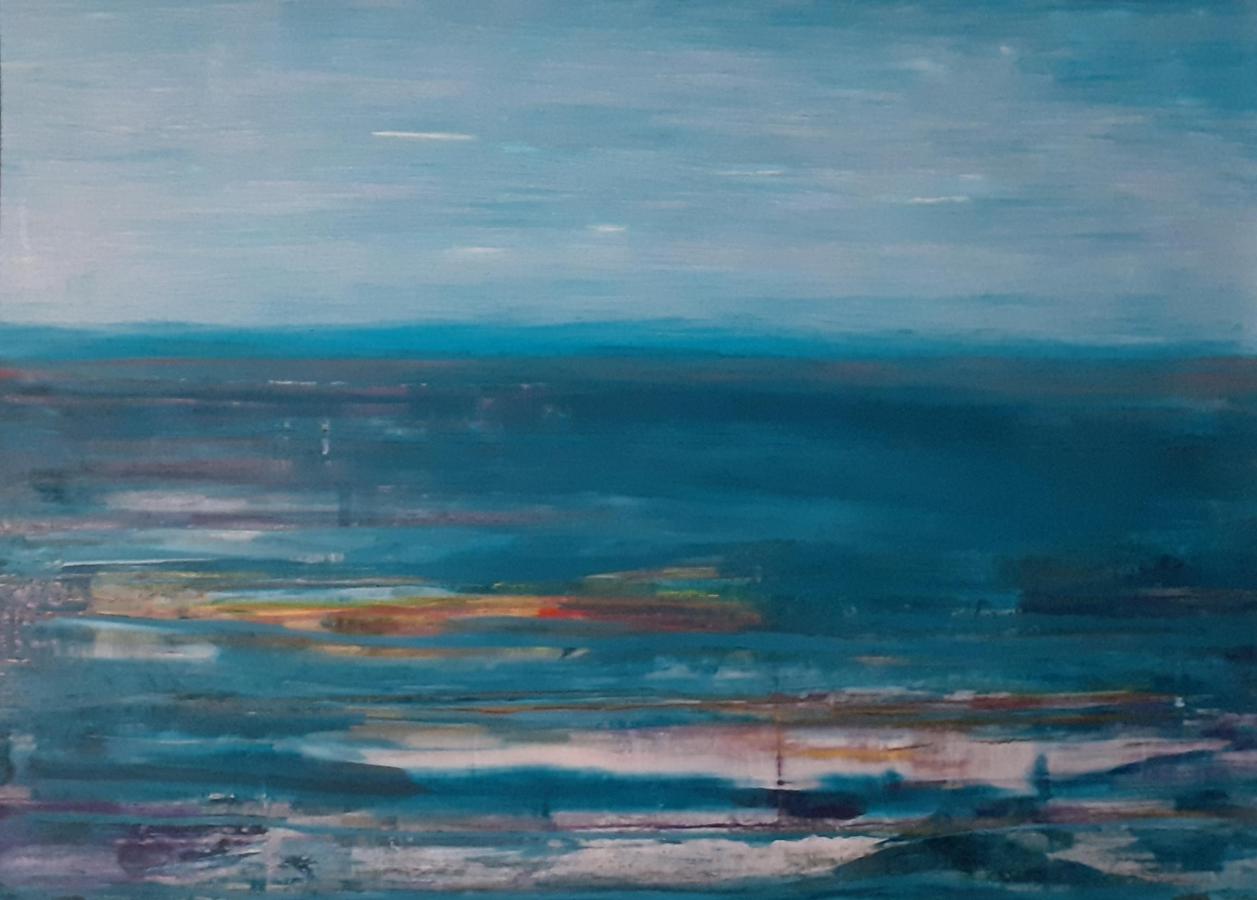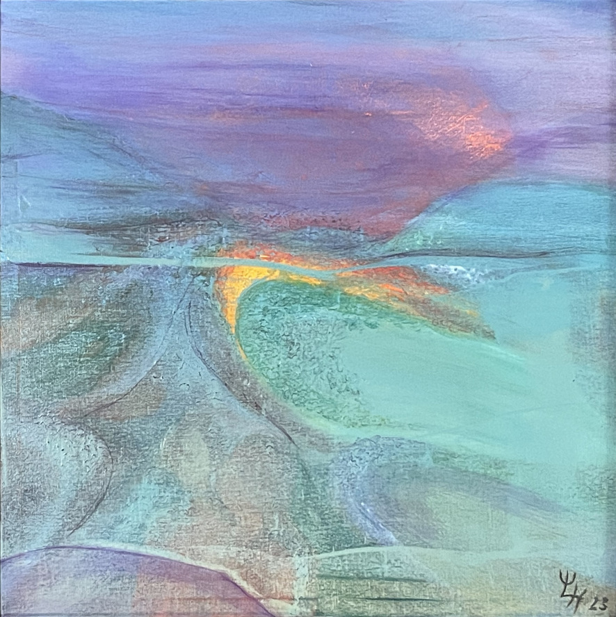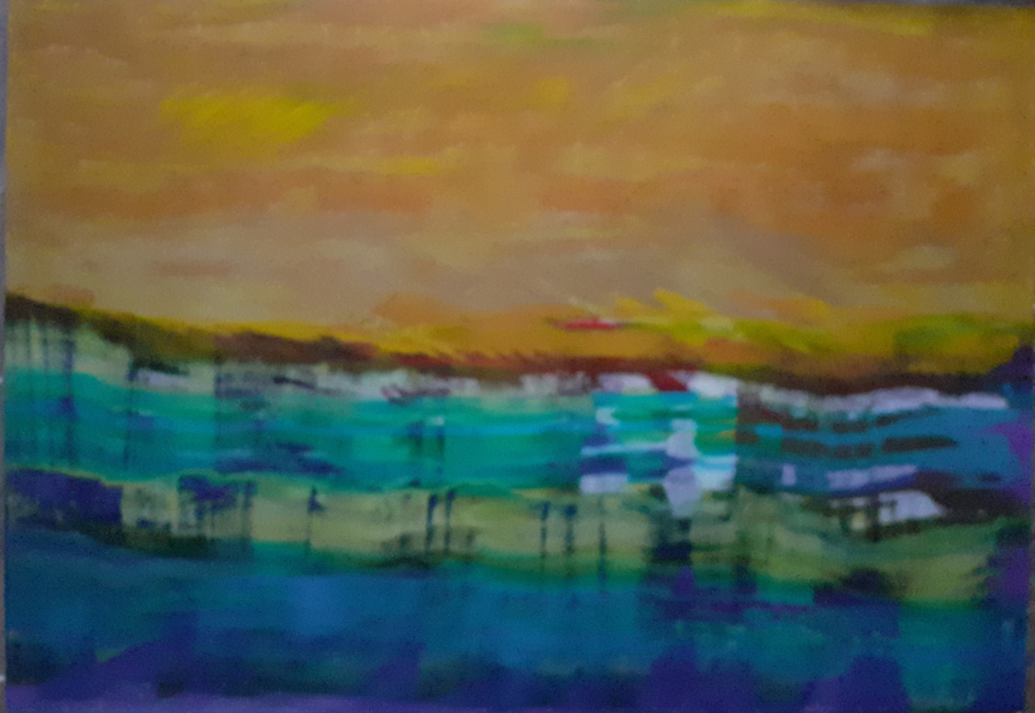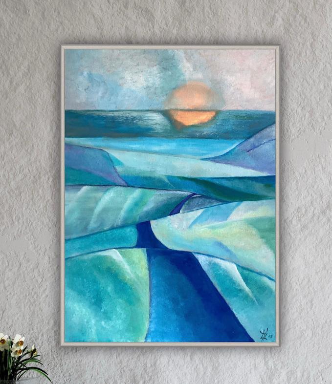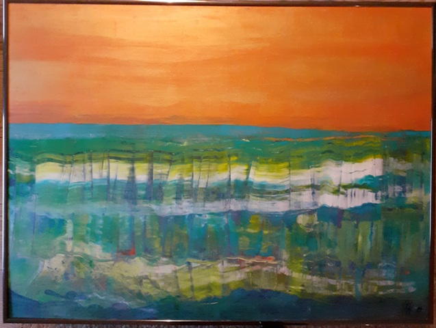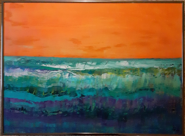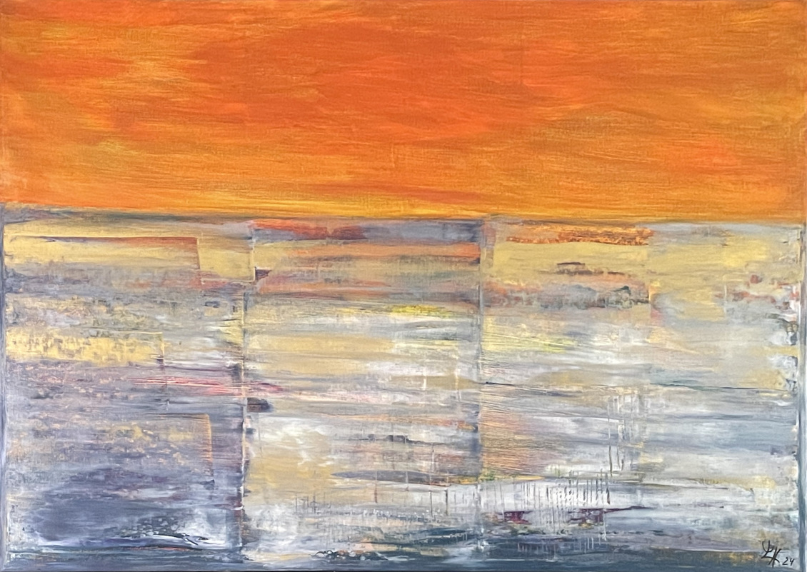 Beim Anblick meiner Malerei hält der Betrachter vielleicht inne, kommt durch die Farben und die horizontalen Linien zur Ruhe und Meditation. Assoziationen zu Meer, unendlicher Weite, Tagesgezeiten, Sonne, Licht und Wasser als elementaren Seinsgrundlagen sollen angeregt werden.